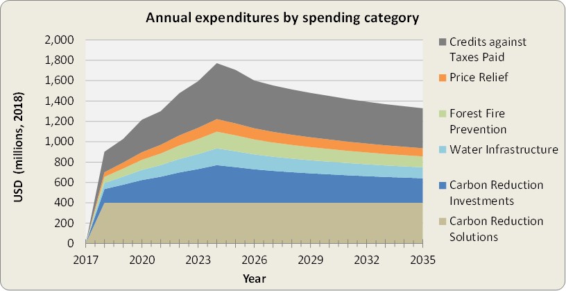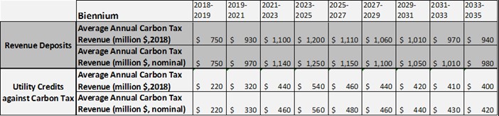 Using a proprietary modeling system, the Washington Business Alliance analyzed the expected outcomes of Senator Palumbo’s Carbon Tax Bill, Senate Bill 5930.  SB 5930 is projected to generate a peak of roughly $1.8 billion/year in 2024 (in USD, 2018), and reduce greenhouse gas emissions by a similar amount as the Clean Air Rule (CAR): around 180 million metric tons of carbon dioxide equivalents (MtCO2e) give or take around twenty percent. Emissions in 2035 are projected to be around 9% lower than 1990 levels.  The Washington Business Alliance will continue to refine these estimates and provide timely, data-driven reports as bill details emerge, including careful modeling of the Carbon Reduction Fund impacts.