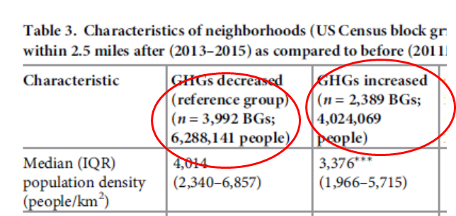 Figure 2: Clip of original study Table 3 concerning full population characteristics sorted by GHG trends of nearby facilities