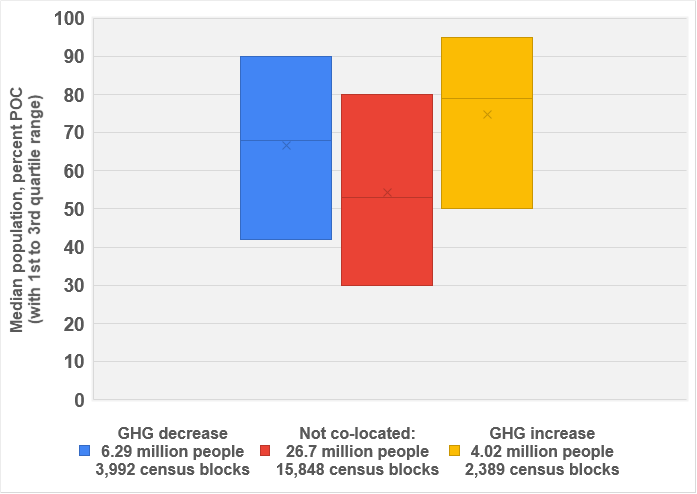 Figure 4: Reported median and median range of people of color population in census blocks experiencing a GHG decrease (blue), GHG increase (yellow), or not in proximity to a regulated facility (red)