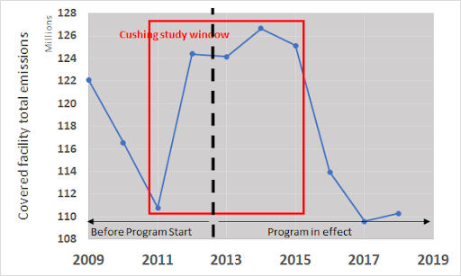 Within finding 2, the assertion that “most regulated facilities (52%) reported higher annual average local (in-state) GHG emissions after the initiation of trading,” is commonly applied in discussions about disadvantaged community (DAC) impacts from emissions trading systems. This finding is heavily dependent on the timeframe selected and power sector trends outside of the programs influence. In addition, the correlation between co-pollutants and GHGs is not straightforward.