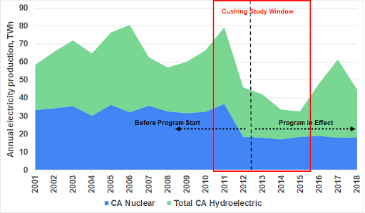 Figure 6: In-state production of nuclear and hydropower from 2001-2018