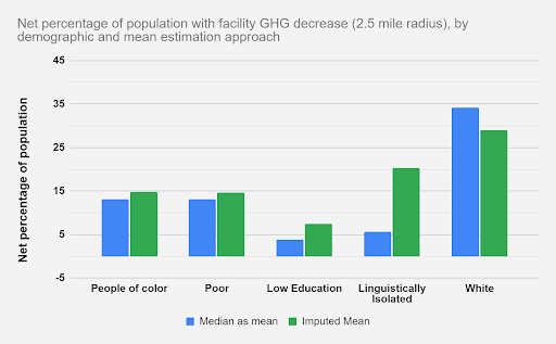 Figure 3: Approximation of net share of population experiencing a decrease in nearby GHG emissions, shown by characteristic and for two separate mean estimation approaches