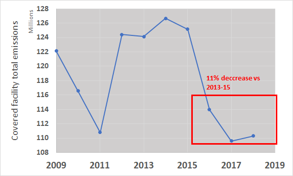 Figure 3: California covered facility greenhouse gas emissions, with box highlighting recent years not covered by the original Cushing and Morello-Frosch et al. study