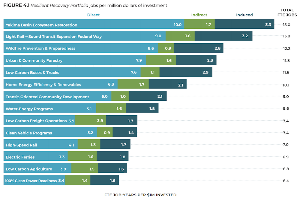 For guidance, let’s look at modeling based on the Building Back Better report’s Resilient Recovery Portfolio . That analysis shows that a portfolio of the type that the CCA (SB 5126) could fund, would not only protect jobs but also generate up to 195,000 full-time-equivalent job-years and generate up to $13 billion in employee compensation through 2030: