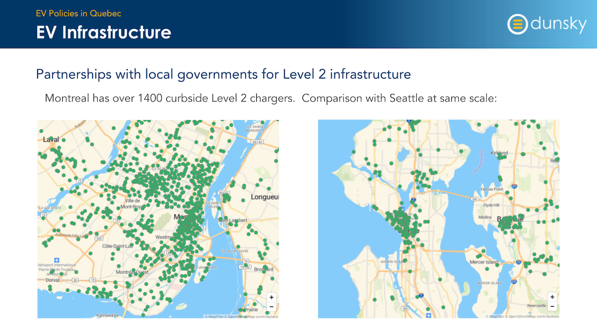 Another lesson from Québec is the power of partnerships — in particular the partnership between power provider Hydro-Quebec and the Provincial government of Québec. Together they have made installation of EV charging infrastructure a priority, leading to the installation of over 1,400 curbside Level 2 chargers.