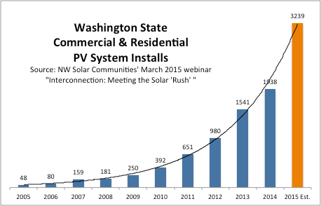 PV market growth is evidenced along the entire supply chain. One local PV installer, having operated 14 years in Puget Sound, reported a twofold increase in demand for their services over just the past two years. This installer shared that Washington-made inverters and panels are keeping up with demand. However there is a shortage of electricians, slowing down the process of connecting PV system installations to the grid. Other potential roadblocks in the supply chain, be it permitting, installer skills, or rainy weather were not current issues.