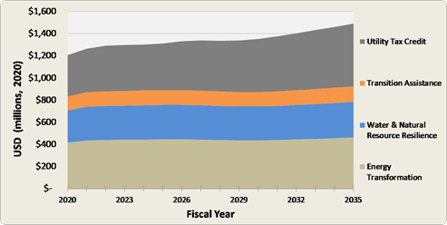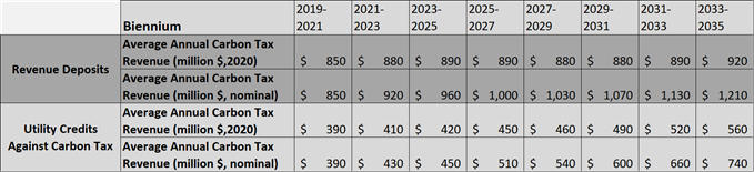 The total revenue from the tax through 2035 is projected to be nearly $15 billion in USD, 2020, with a generally steady annual flow. Utility credits against the carbon tax are projected to total nearly $7 billion over the same time period. The revenue implications, with an estimated ± 5% uncertainty, are projected at the following average annual amounts for each biennium: