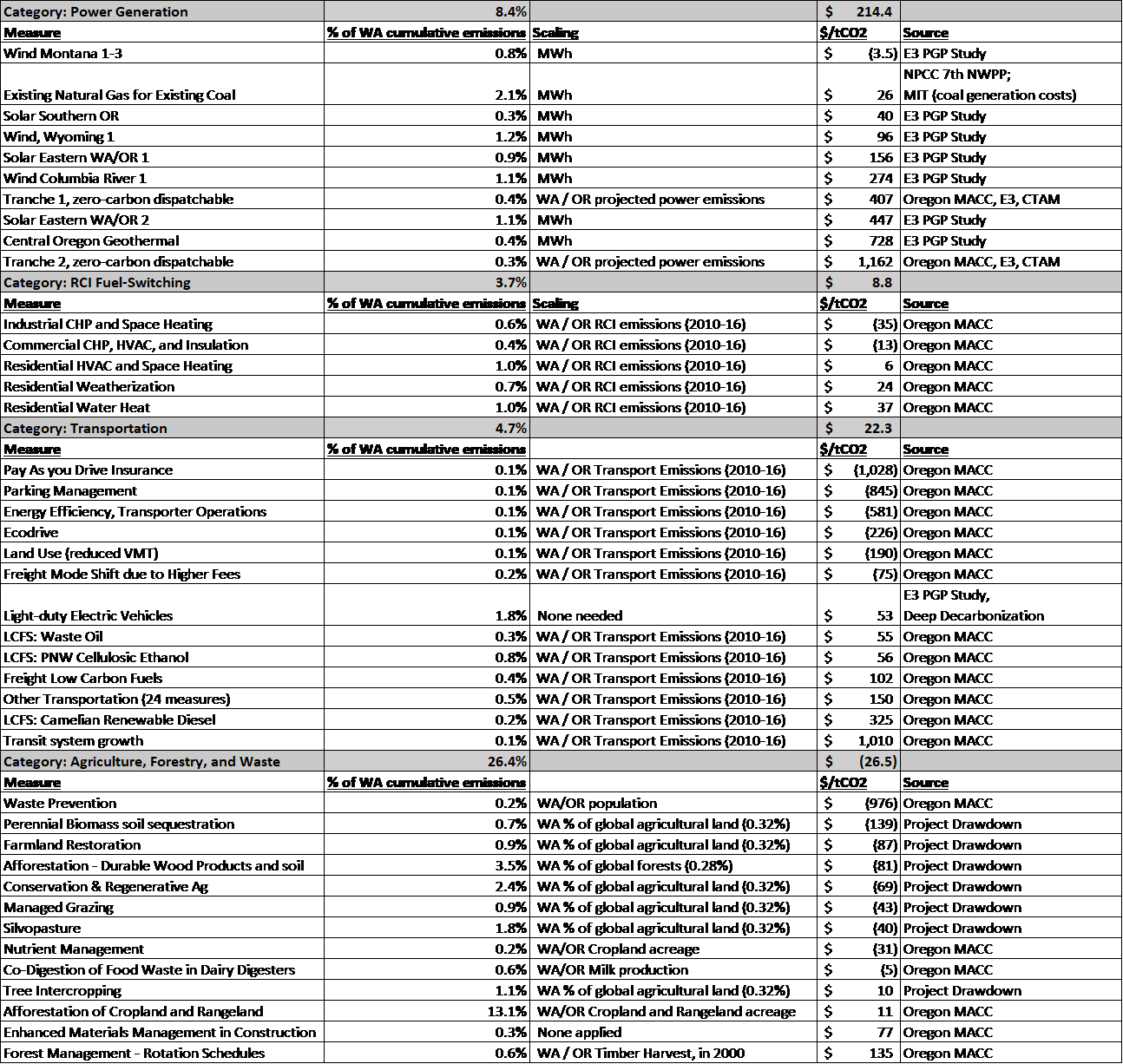 Sources of information and methodology notes: Measures incorporated are from Project Drawdown Plausible Scenario and the Oregon MAC Curve study Scenario 1 or Scenario 2 (afforestation only).