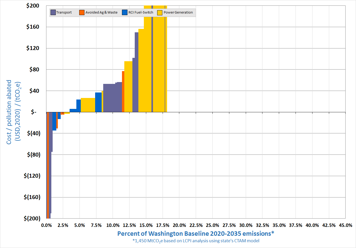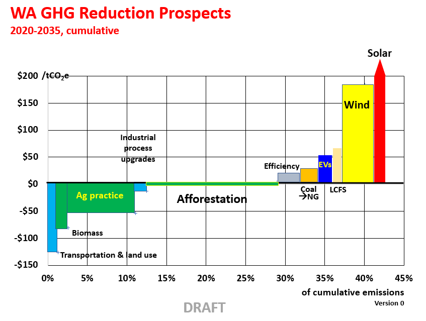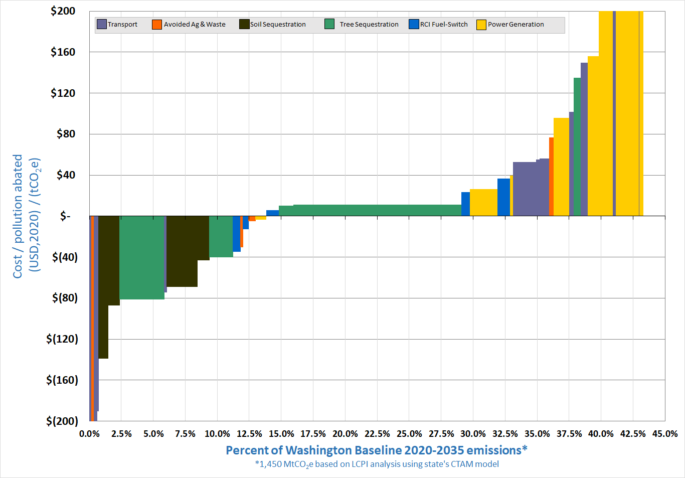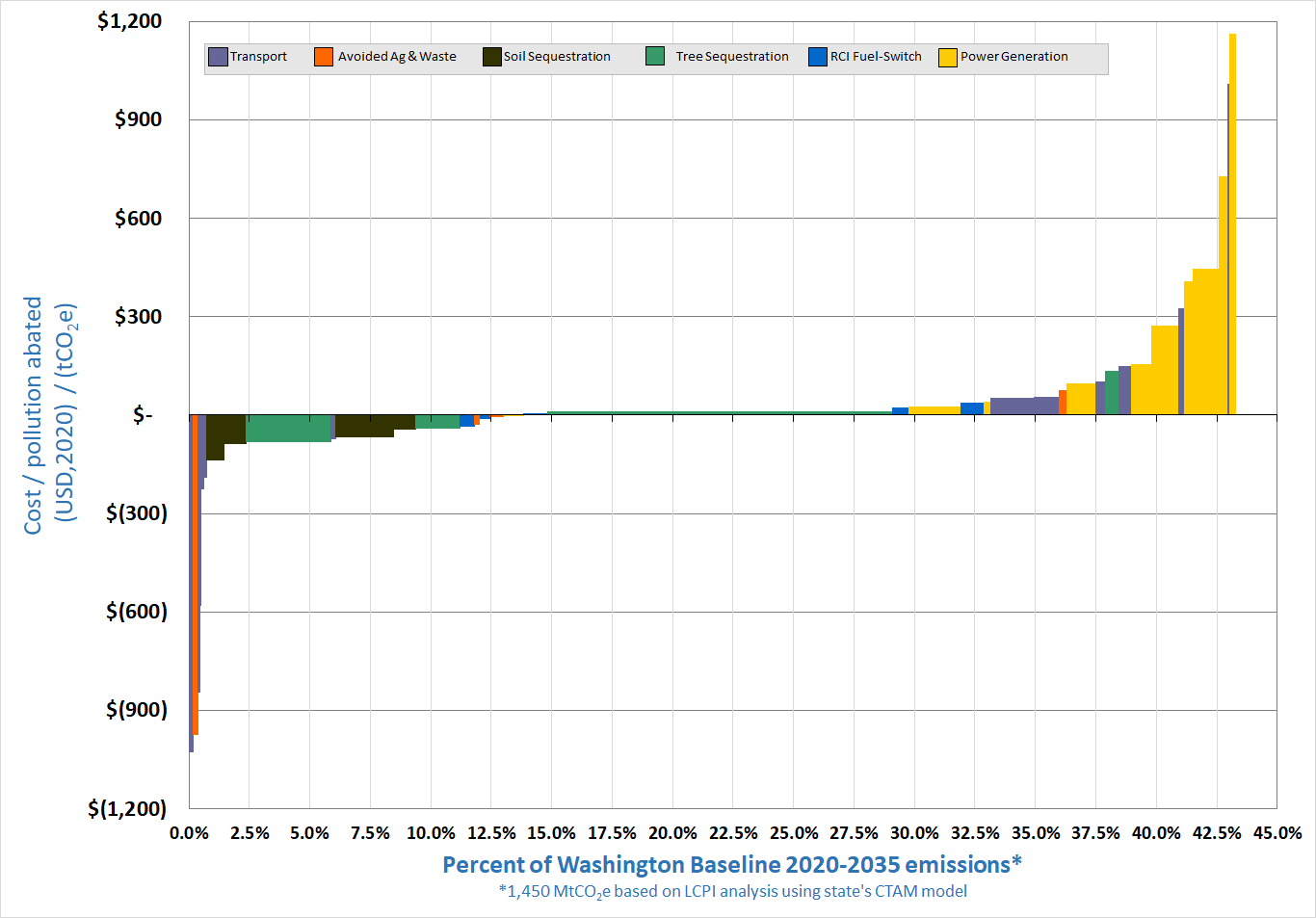 In this article we present a useful way to visualize this range of possibilities, which we have applied to Washington state. The data presented is a starting point for the Low Carbon Prosperity Carbon Reduction System project, with Version 0 developed from preliminary data and indicating that about 30% of our emissions through 2035 can be reduced for negative or near-zero cost.