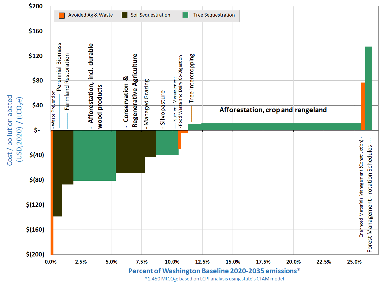 The Agriculture, Forestry, and Waste sector includes both sequestration (soil and tree) as well as avoided emissions from fossil fuel emissions and waste. The sector-specific MAC Curve is shown in Figure 5: