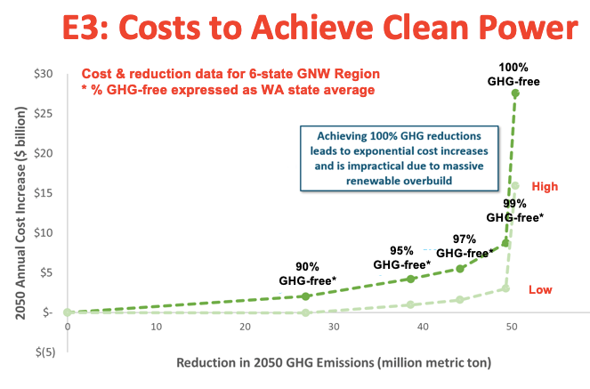 100% GHG-free.   E3 projected costs of achieving 100% GHG-free electricity and system reliability for the GPNW balancing region.  The graph shows progress to GHG-free emissions (X-axis) and the resulting GPNW regional costs/year (Y-axis). In the E3 scenarios, the cost jump up in the last 1%.   E3 and others have shown potential pathways to lower costs. Examples include biogas, long term storage, and lower cost nuclear As E3 also eliminates the use of imports in this last step to 100% GHG-free, CaPI’s upper estimate halves the jump to a 2.5 times increase  (see Section IV below). The E3 biogas scenario, on the other hand, projects costs for 100% GHG-free only incrementally higher than the reference 99% GHG-free case. This smaller proportional increase is used to factor from 99% to 100% GHG-free in the Low Cost scenario.  Note there is considerable uncertainty in this estimate.