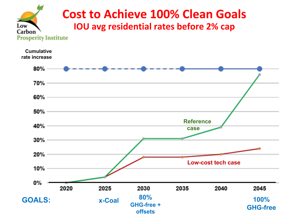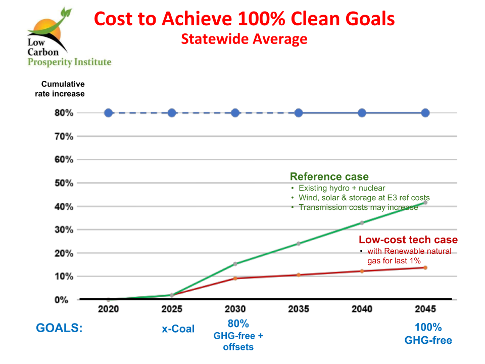 At the interim target of a minimum 80% GHG-free power plus mitigation of remaining emissions, costs are projected to rise 10% to 15% on a statewide average of which 7% is from replacing coal that otherwise is not slated for closure plus building additional system reliability for integrating renewables.