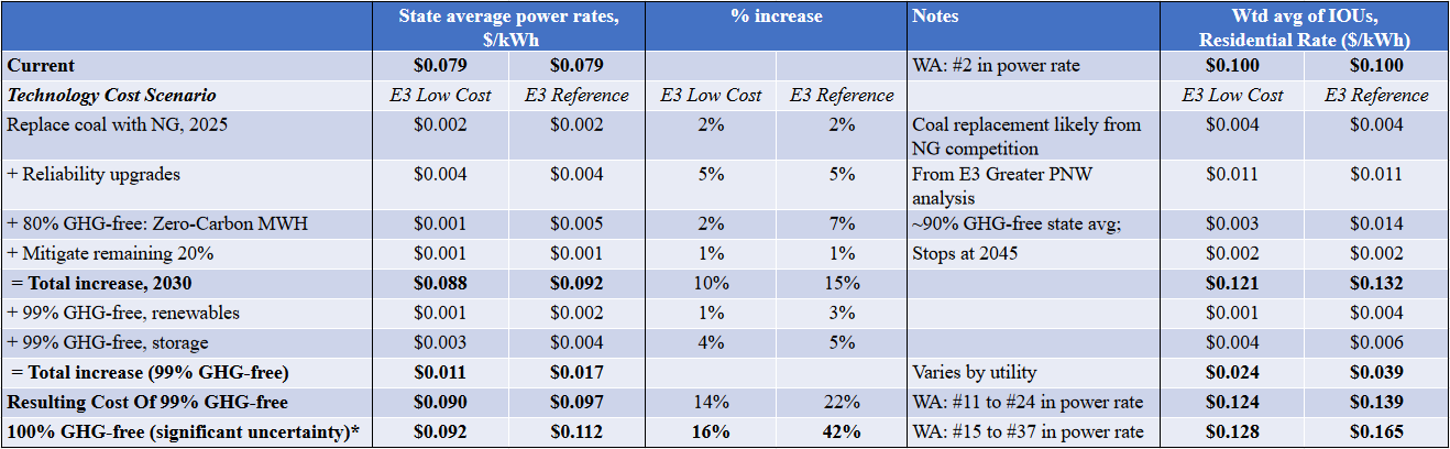 Secondly, the proportional rate increase from 99% to 100% GHG-free was based on the ratio of additional costs ($/MWh) in the E3 2019 Resource Adequacy in the Pacific Northwest of the cheapest 100% pathway (with Biogas, $14-$30/MWh over the reference) to the 98% Reduction scenario resulting in 99% GHG-free ($10-$28/MWh).   The result is an additional 16% additional rate increase (not 16% total rate increase) relative to the 99% GHG-free scenario.