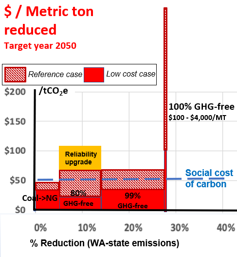 The graph at right shows the progression of GHG reductions on a step by step basis, with percentage of state emissions reduced on the X-axis, and the cost per metric ton on the Y-axis. The step up in renewables to reach 80% GHG-free includes reliability upgrades costs, although those may be incurred prior (in the coal to natural gas switching) or after (in the expansion to 99% GHG-free) the 80% GHG-free milestone.