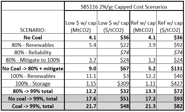 This capped scenario projects to a statewide 85-90% GHG-free system in 2030 with roughly one-third to ninety percent of the remaining emissions offset. Costs to achieve these reductions are roughly $600 to $700 million per year, in addition to the nearly $150 million per year estimated for transitioning off the remaining coal by 2026. Translated to costs per avoided ton of carbon, costs are roughly $70-$130/tCO2 for avoided emissions above and beyond coal closure, or $60-$90/tCO2 when including the initial transition away from coal.