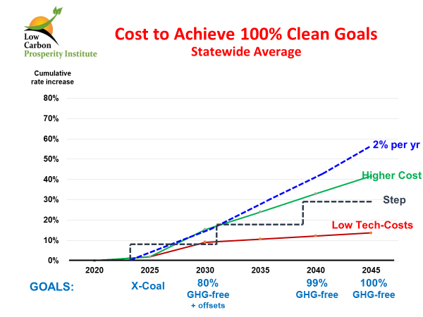 Prior work. We previously reported projected rate impacts of the steps leading to 100% Clean Power – the summary table of which is shown below. Costs shown are as-incurred, aggregated across the full system. Results are shown both state-wide and for Investor-Owned Utility (IOU) residential rates.