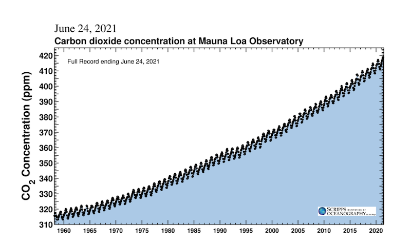 Ralph Keeling would beg to differ. Professor Keeling is director of the Scripps CO2 Program that monitors CO2 in the atmosphere and tracks the “Keeling Curve”. It is this graphic that demonstrates the direct correlation between increasing CO2 accumulation and increasing extreme climate events — such as the “historic, dangerous, prolonged and unprecedented” temperatures that are baking the Pacific Northwest today:
