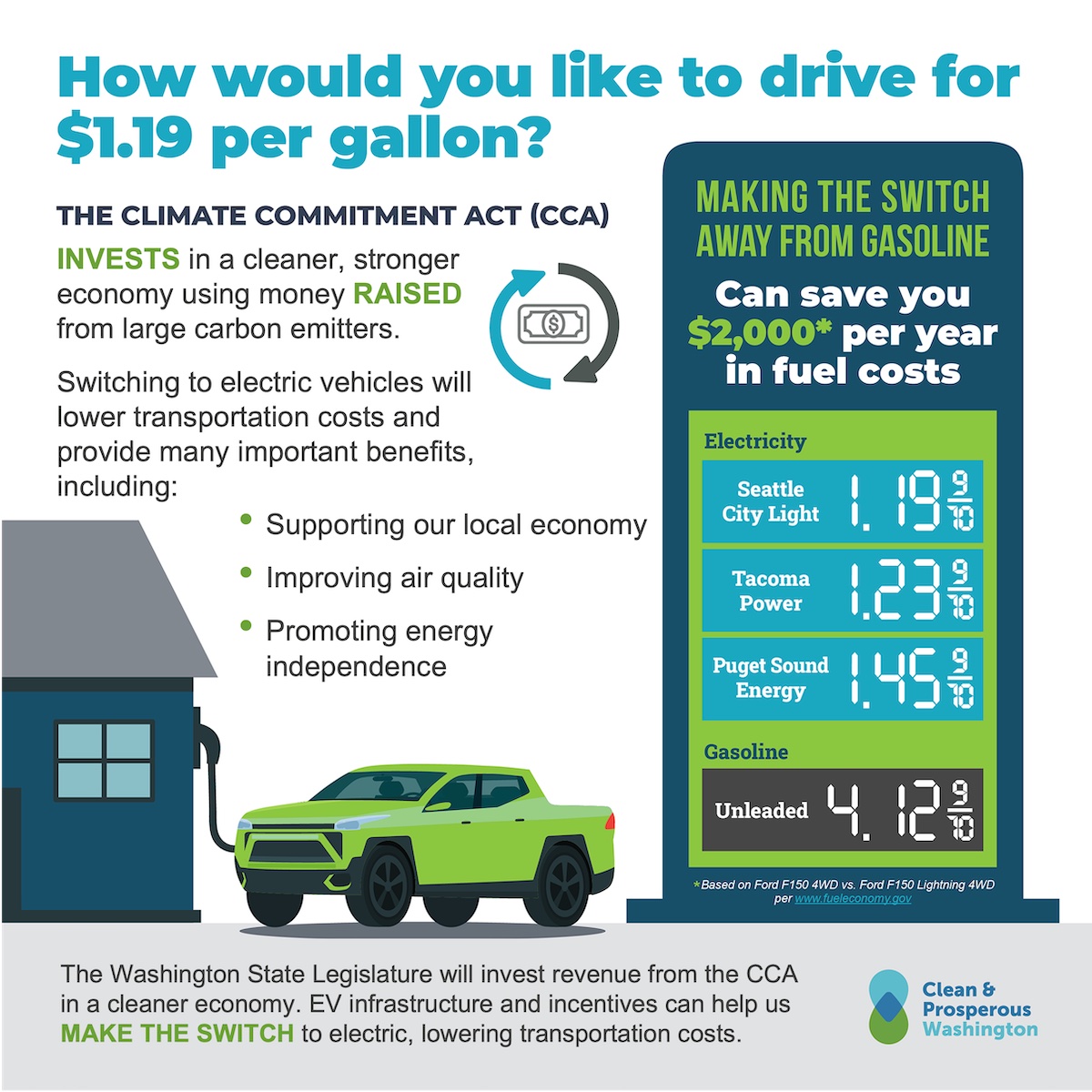 Investing in accelerating the transition to stable, locally-sourced-energy for transportation means lower and more predictable prices for businesses and consumers. With funds raised from the Climate Commitment Act auction of allowances, we can build infrastructure, support businesses transitioning fleets, and help more drivers purchase zero emission vehicles. With greater energy self-reliance Washington drivers stand to benefit from lower costs too.