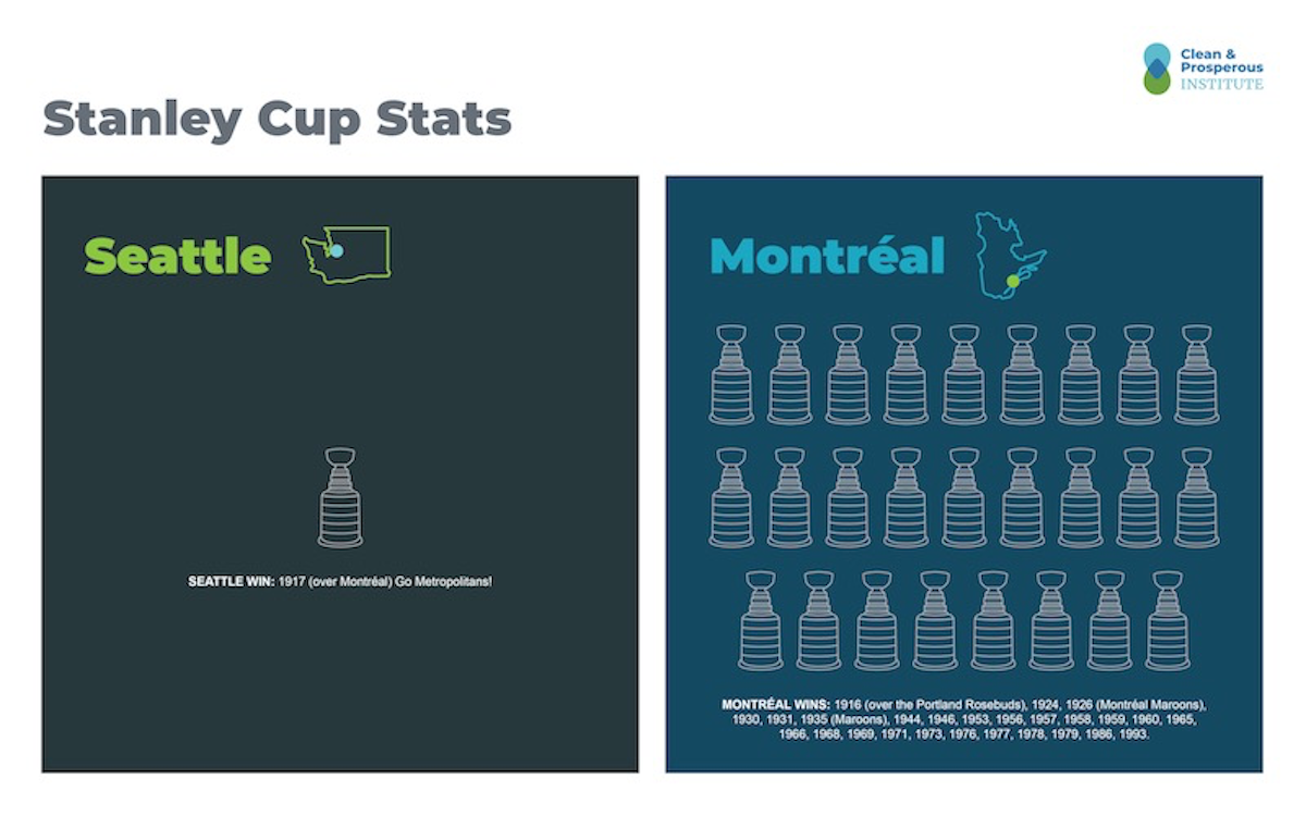 The Seattle Metropolitans beat the Montréal Canadiens to win the 1917 Stanley Cup. In 1919 Seattle and Montréal faced off again, but the series was canceled after the fifth game (tied 2-2-1) because of the flu epidemic. The Stanley Cup was not awarded that year. (Per the Seattle Times: “The greatest ice hockey series ever staged ends in a draw”.) Fascinating. Should we start a petition to resume that series, now that Seattle again has a team? (Let us know on Twitter.)
