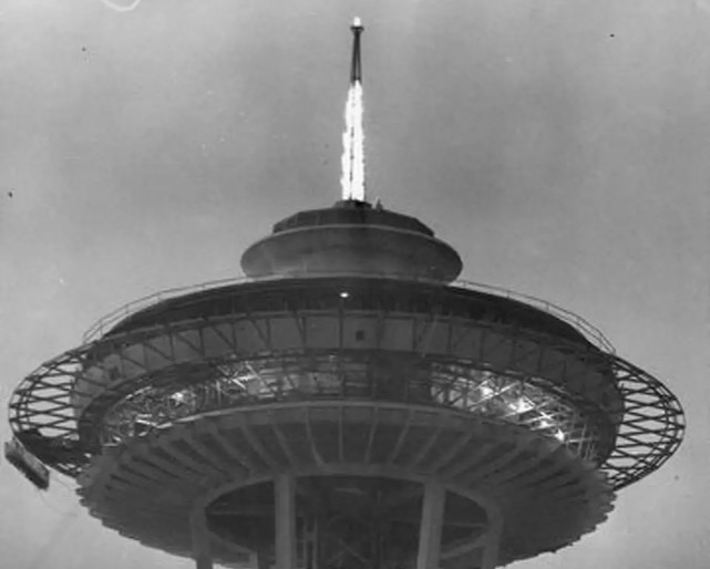 The Space Needle, early 1962. Note the flames coming from the antenna; the Needle was equipped with natural gas, which was burned at the top periodically for dramatic effect. P-I File