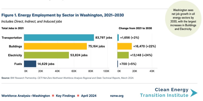 The Net-Zero Northwest Workforce-Washington analysis projects net job growth in every sector – electricity, fuels, buildings, and transportation – 14% overall from 2021 to 2030.