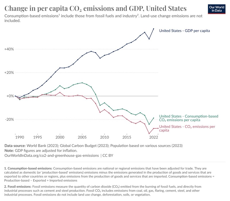 Here in Washington state, our economy has grown almost 24% since 2005, yet over the same period greenhouse gas emissions have held relatively steady, and the amount of GHGs per person declined 15%. The state has reduced its carbon intensity as measured in terms of emissions per capita or per economic output (GDP). Relative to 2005, the amount of greenhouse gas emissions per million dollars of GDP declined 51%.