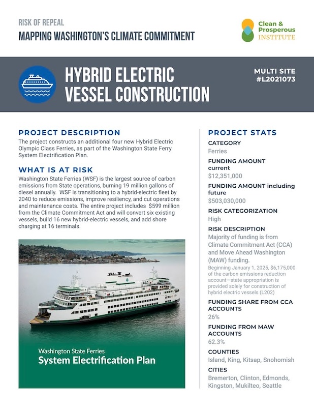 Now the Cap-and-Invest Climate Commitment Act is funding the ferries. Without it, ferry construction and conversion is at high risk, per this analysis from the Clean & Prosperous Institute: