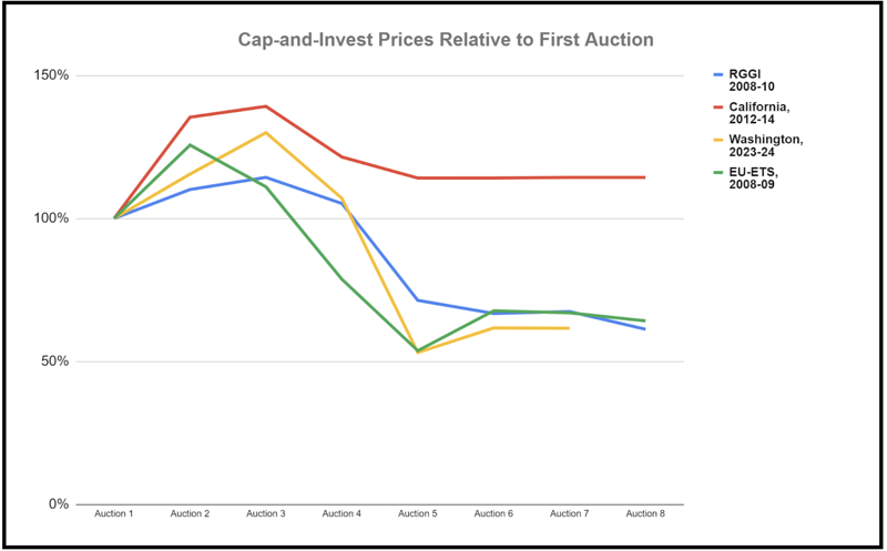 Much like in other major cap-and-invest programs (see chart below), Year 2 (2024) prices have settled well below the initial peaks of Year 1 (2023) as the program matures and more entities secure enough allowances to meet several years of compliance deadlines (most emissions for 2023 and 2024 require compliance via allowances in November 2027, a mechanism that differs substantially from a direct tax).