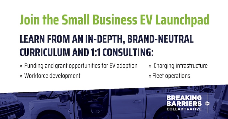 Breaking Barriers Collaborative is now accepting applications for their 6th Fleet Electrification Accelerator cohort! This program simplifies EV adoption by equipping businesses with trustworthy resources and expert networks, enabling them to create cost-effective electrification plans and put them into action.