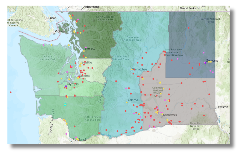 The Build SHIIT map displays all 258 clean energy and industrial modernization projects identified in the Build SHIIT study and provides a regional view of energy capacity, economic activity, and job growth potential across Washington. Users can explore where an estimated potential 24 GW of new electricity generation and 13 GW of storage are located in the state’s clean energy pipeline.